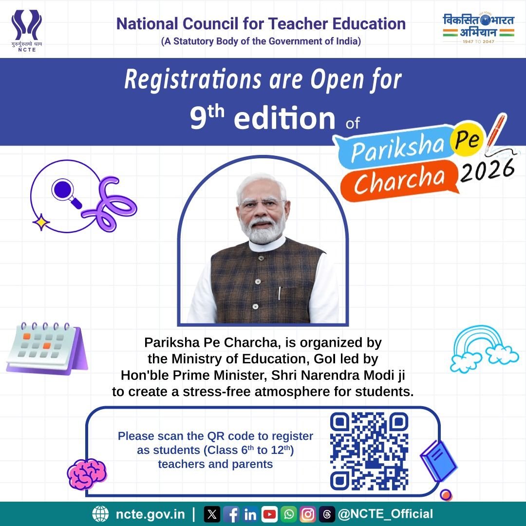 You & Your ward are invited to participate in the 9th edition of Pariksha Pe Charcha 2026, an interactive programme with Hon’ble Prime Minister Narendra Modi. This is a wonderful opportunity to share your thoughts on exam stress and learn practical tips for success.
